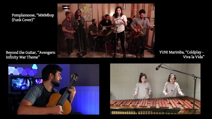 Today, I’d like to talk about the portion of YouTube’s vast music library that is made up of cover songs by amateur and independent musicians. YouTube covers vary in genre and style, from straight-ahead, full-band performances; to solo acoustic renditions; to other, less common solo instrumentals, like Coldplay done on a marimba.