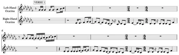 Over the first 90 seconds of the video, Patanen crafts two small ocarinas out of sweet potatoes, and a larger one out of a butternut squash. He carves out the centers, bores holes in the sides, and tunes them with the aid of a Casio keyboard. The gamuts of the smaller instruments are dictated by the distinct registral shift that characterizes each line of “Africa’s” verse, as shown here. The first half of each line explores the upper fourth of the major scale, while the second half lies only in the lower fifth. Presumably, the tonal range of a sweet potato is relatively limited, making this division both serendipitous and necessary. (That last sentence isn’t going to help convince my in-laws that music theory is a real career.)